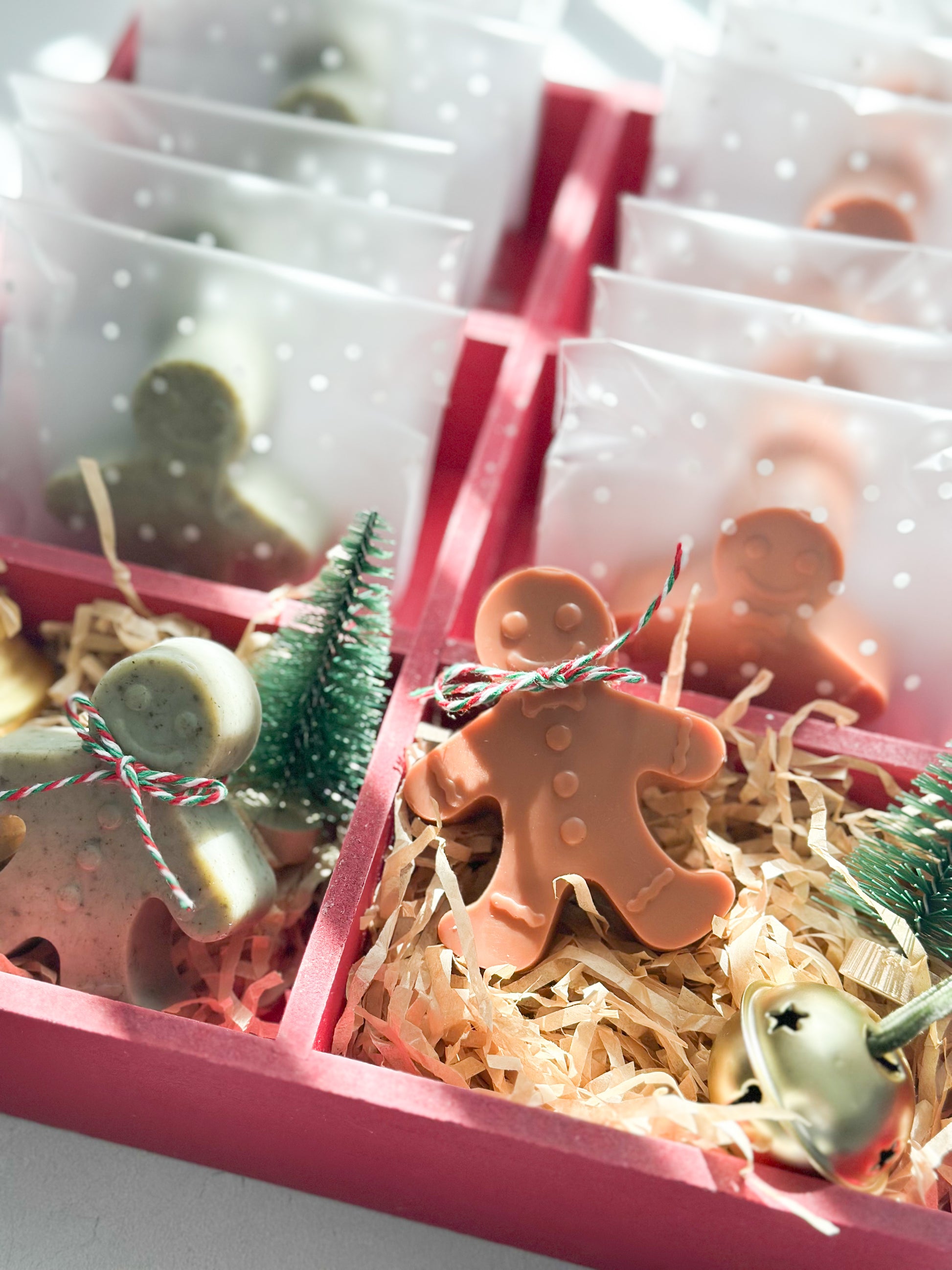 ✨ Red Gingerbread Man – Colored naturally with Moroccan red clay and infused with a warm essential oil blend of lavender, orange, and patchouli. This bar gently cleanses while grounding your senses in cozy holiday comfort.